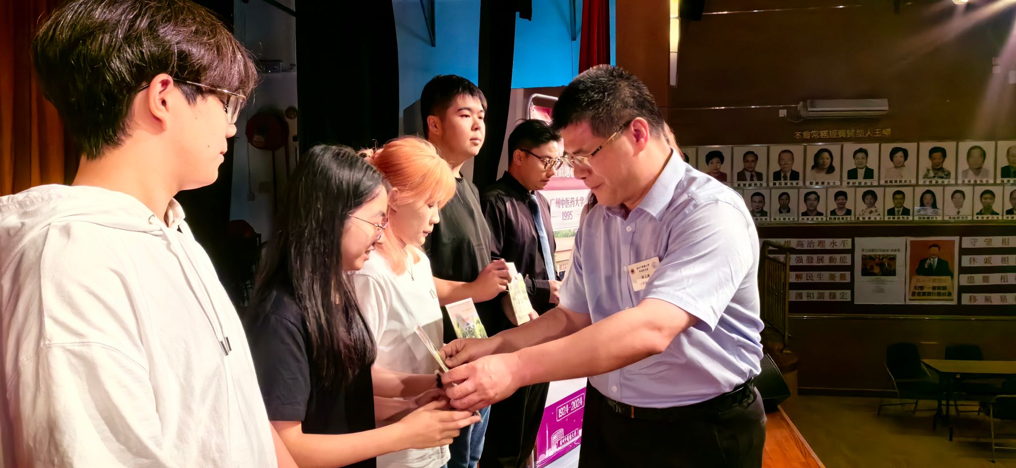 廣州中醫藥大學18日在香港組織校友迎新會,學校黨委書記陳文鋒代表學校把編號為「1924」「1939」「37」「100」的錄取通知書親手送到香港新生手中。(受訪者供圖)
